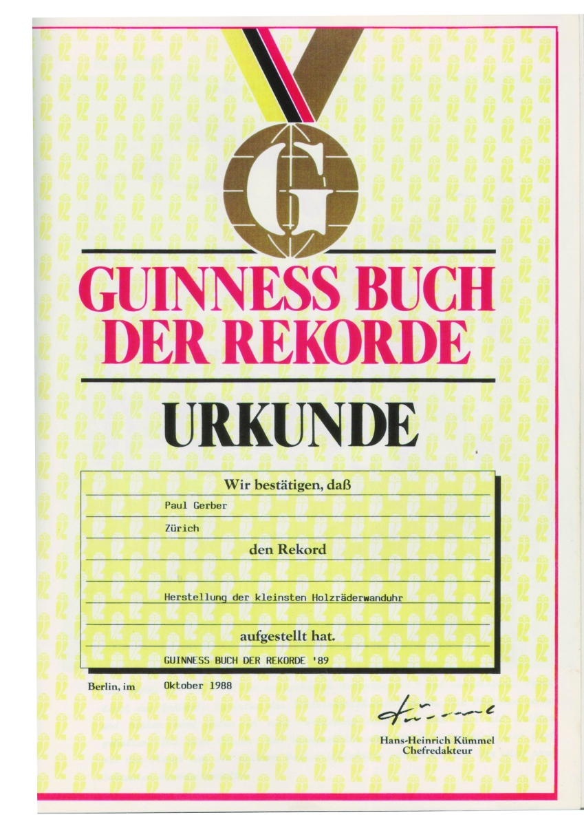 Diese kleinste Holzräderuhr (Miniatur-Kuhschwanz-Augenwender-Wanduhr im Schwarzwälder Stil) aus Buchsbaumholz mit einer Werkhöhe von 22 mm schaffte 1989 den Eintrag ins Guinness-Buch der Rekorde