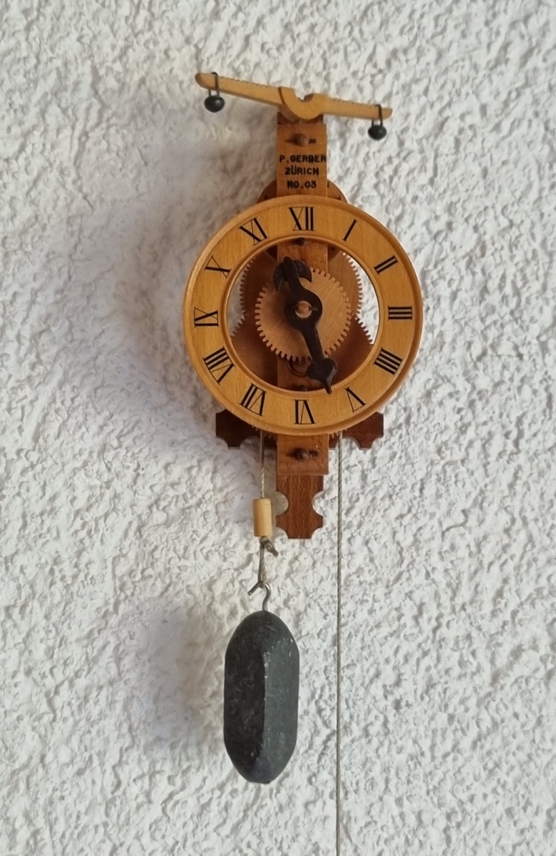 Paul Gerber’s Miniatur Waagbalkenuhr «Engadiner Zytli», hat er 1994 entwickelt und angefertigt. Sie ist 74 mm hoch, der Ziffernring hat einen Ø von37 mm. Die kleine Wanduhr wurde aus Buchsbaum- und Zwetschgenbaumholz angefertigt, sie läuft 1 Tag